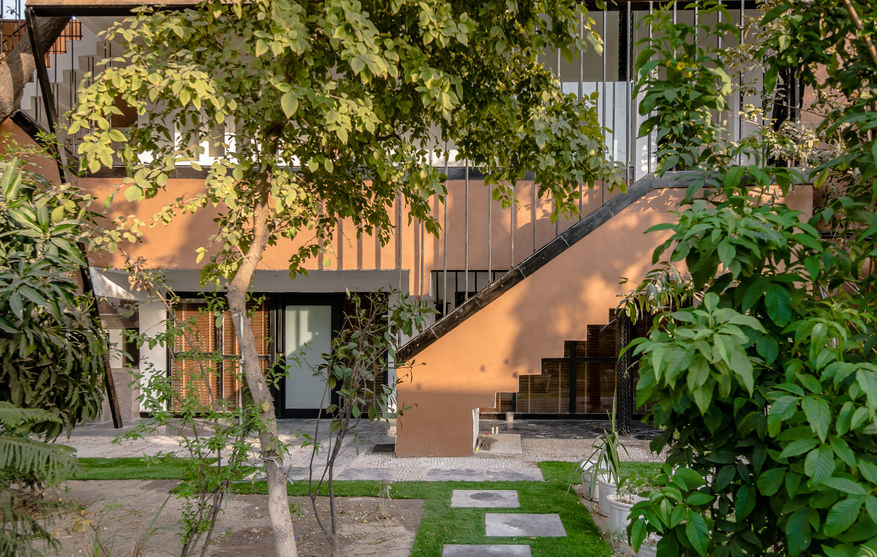 In this retrofit project, two existing houses come together when a third unit tie them to form a continuous L-shaped entity, with a lush green courtyard garden. Designed for a joint family in Begampur village of Rohini, Delhi, the project boasts an earthy material palette, of terracotta shingles and Badarpur plaster finish.